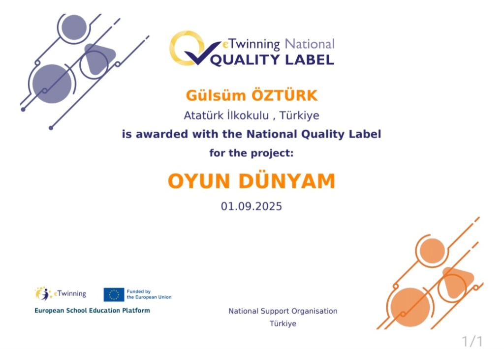 Okul Müdürümüz Gülsüm ÖZTÜRK öderliğinde okulumuz 3. sınıf öğrencileri Buket Berre DURMUŞ, Ömer Gökay FİDANCI, Fatma Azra İBİŞ, Muhammet ALTUN ve Eymen PEKYÜREK "Oyun Dünyam" Projesine katılarak yaptıkları çalışmalarla E-Twinning Ulusal Kalite Etiketi Ödülü ile ödüllendirilmişlerdir. Okul Müdürümüz Gülsüm ÖZTÜRK'ü emeği geçen velilerimizi ve öğrencilerimizi tebrik ederiz.